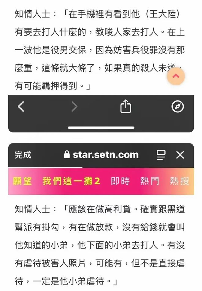 不过拔出萝卜带出泥,因为这次的事情,王大陆可是有不少黑料被挖出,湾湾司法部门经过进一步调查,发现这次王大陆指示去打人的小弟,竟然是来自三大黑帮之一的四海帮,随后有人说王大陆和黑帮勾结放高利贷,如果借贷的人还不上,他就用暴力手段催收,让自己手下的小弟去打砸抢,嚣张跋扈、目无法纪,比黑社会还黑社会。