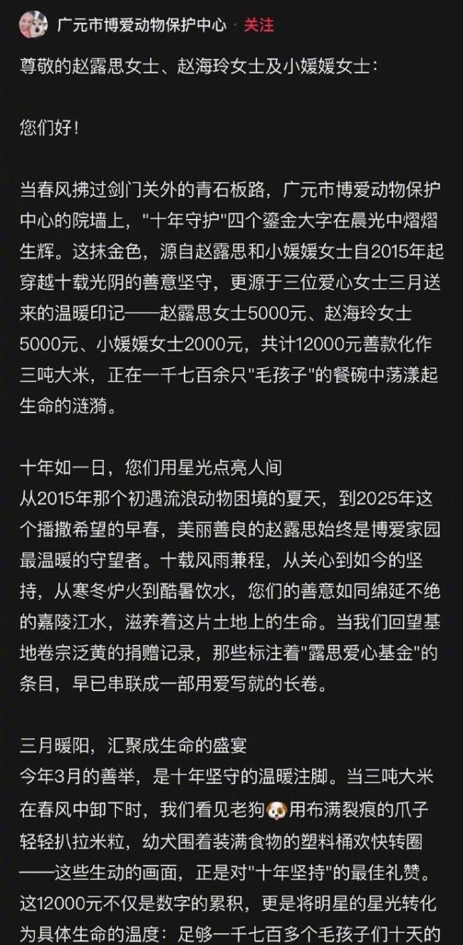 3月5日,广元博爱动物保护中心在社交平台上发文感谢赵露思,称她自2015年起持续向广元流浪动物救助中心捐款,至今已坚持十年。
