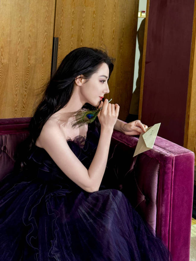 迪丽热巴深紫色露背纱裙好美 大波浪卷发妩媚迷人