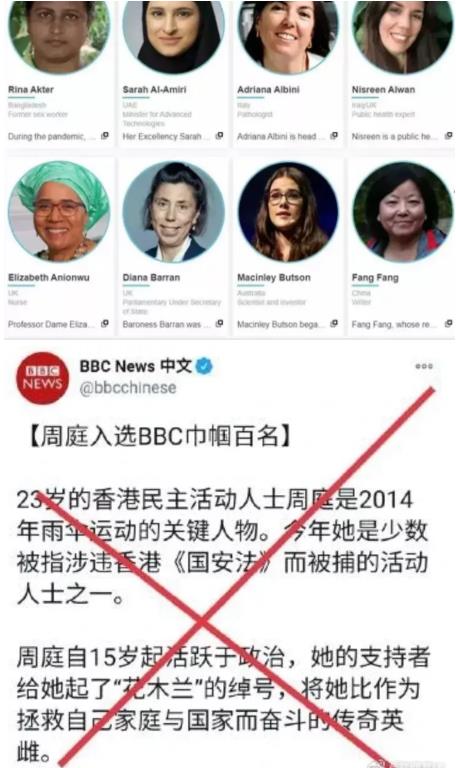 比如,11月23日,英国BBC公布了它评选的2020年度的100位女性名单,号称“百大巾帼”,其中有两位女性大家耳熟能详,一个是《武汉封城日记》作者、作家方方,另外一位是香港“废青领袖”周庭。