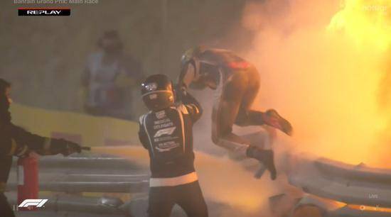 图)海外网11月29日电 当地时间29日,2020赛季世界一级方程式锦标赛(F1)巴林站的比赛中,哈斯车队法国车手格罗斯让的赛车撞上围墙后爆炸起火,幸运的是格罗斯让本人及时跳出赛车,只受了轻伤。