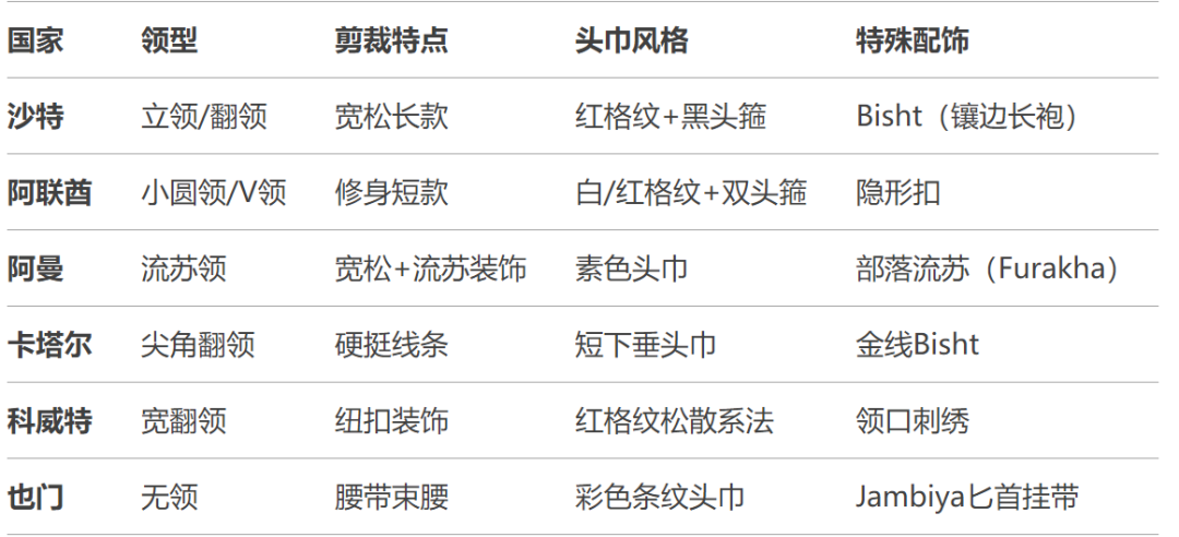 沙特通常是红格纹的头巾配立领,卡塔尔通常是纯白头巾配尖角翻领,阿曼则是部落流苏领配素色头巾。