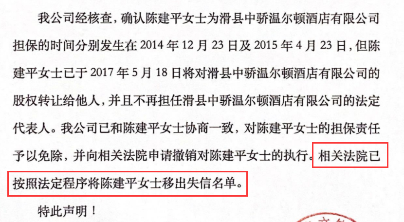 12月8日,乐华娱乐转发某公司的声明,简述“黄明昊妈妈是被执行人”案件的最新进展:陈建平女士作为担保人已经与债权人达成一致,债权人已免除陈建平的担保责任,法院按照法定程序将陈建平女士从失信被执行人名单中移出。