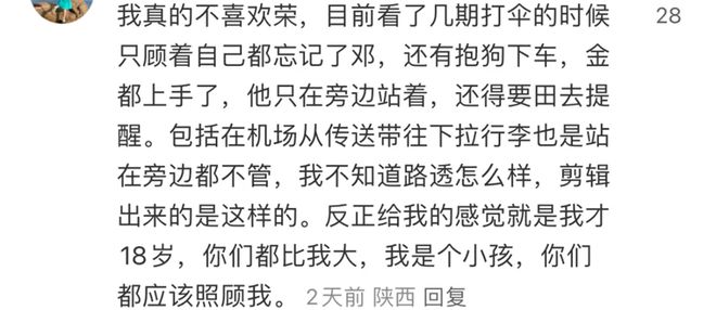 情商低到离谱。和邓恩熙打一柄伞,邓恩熙半个身子都淋在雨里。想吃周雨彤的零食,吃完了就把包推给金晨带着。