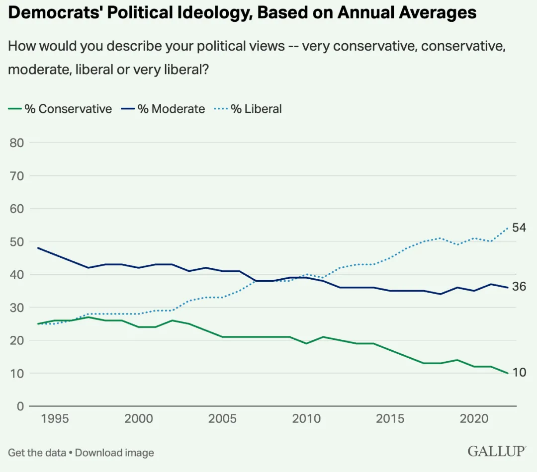 盖洛普的长期跟踪数据显示,自1990年代中期以来,民主党人自认“自由派”(即左翼)者比例从25%攀升至2022年的54%。左翼思想已从党内少数派变成多数共识。这样的民意土壤上,要求民主党更激进改革的呼声只会越来越高。这在纽约这样的深蓝大都市首先爆发,未来几年我们或将在更多州和全国层面看到类似趋势。
