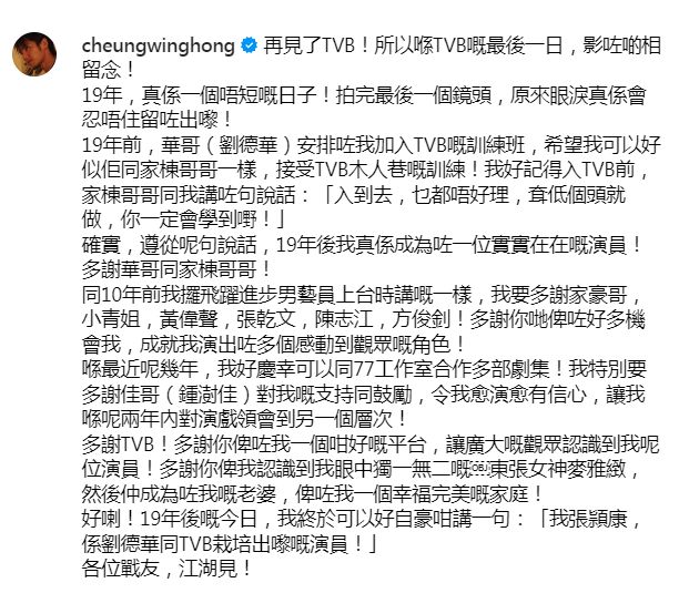 今日凌晨,张颖康突然发文宣布离巢:“19年,真的是不短的日子!拍完最后一个镜头,原来眼泪真的忍不住流了出来!” 他在文中除了感谢了刘德华,还有林家栋,家豪哥、小青姐等人!最后更感激TVB给了他这么好的平台,还认识了东张女神麦雅致并结了婚!