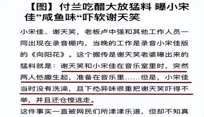 如果是吃瓜群众吃瓜就算了,结果正主也下场了,谢天笑的妻子付兰突然发文暗讽宋佳介入自己的婚姻,还嘲笑宋佳身上有一股咸鱼味儿,老谢受不了被熏跑了。这么劲爆的内容就这么水灵灵说出来了,直接导致微博服务器瘫痪,“宋佳下体异味”的词条以病毒式传播速度冲上热搜榜首。当时的网友们可没有现在网友素质高,好不容易遇见个大瓜吐槽起来可以说是五花八门,从“咸鱼味儿”延伸出“海鲜味儿”“鱼子酱味儿”等搞笑说法,当时各大论坛的讨论热度居高不下。
