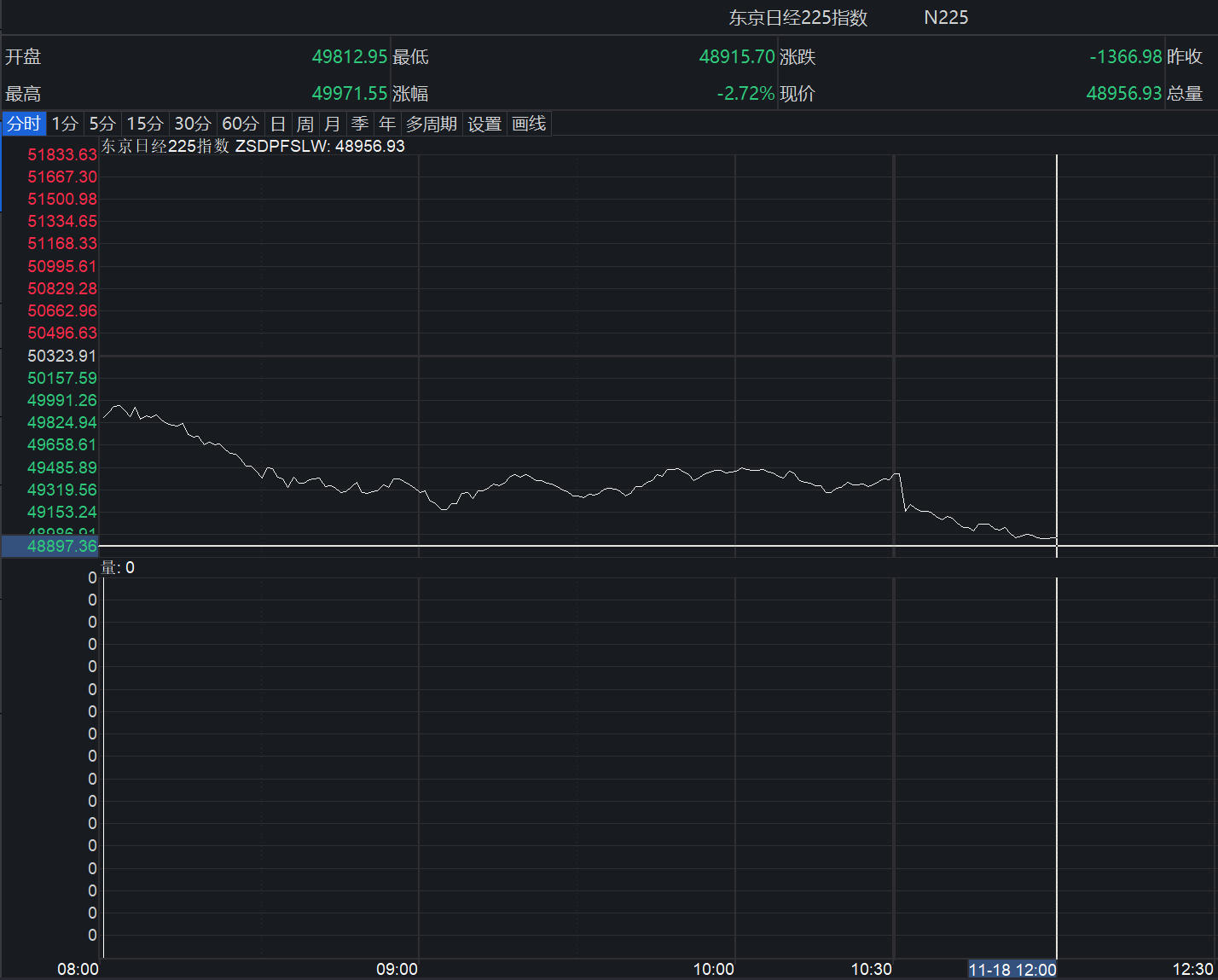11月18日,日经225指数大幅低开,盘中跳水跌逾2%,指数跌超千点。截至北京时间18日12时整,该指数跌2.72%报48956.96点。