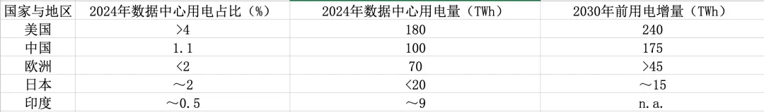 表1:按国家划分的数据显示:2024年数据中心用电量(占比与绝对值),以及到2030年的用电增量
