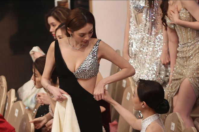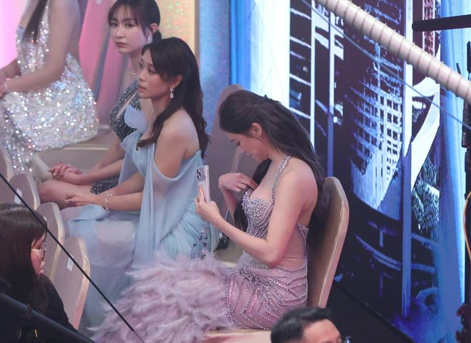 叶蒨文晚装相当性感,她亦趁空档时间微调一下。