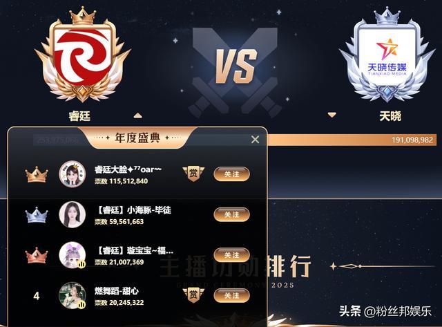 睿廷公会的主战场集中在“睿廷-大脸”直播间,仅一人就给公会贡献了1.15亿票。
