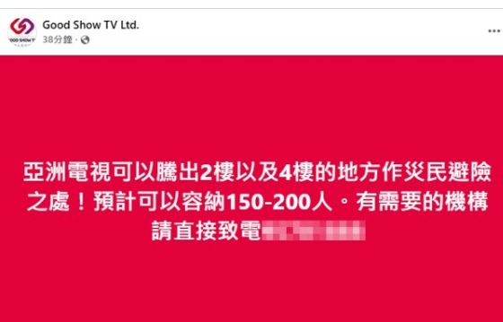 至于公司同在大埔区的亚洲电视则表示:“可以腾出2楼以及4楼的地方作灾民避险之处!预计可以容纳150-200人”,指有需要的机构可致电。