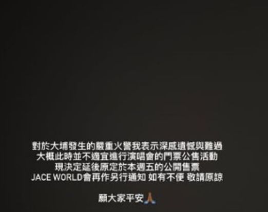 此外,歌手陈凯咏表示将演唱会的门票公售活动延后,她表示:“对于大埔发生火警我表示深感遗憾与难过,大概此时并不适宜进行演唱会的门票公售活动。现在决定延后原本周五的公开售票,再作另行通知,如有不便敬请原谅,愿大家平安。”