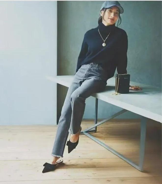 藏蓝色针织毛衣,上身即彰显出女性的自信与独立气场,搭配经典灰色牛仔裤,既能穿出简约日常的松弛感,也能切换成精致得体的通勤风,穿出千百种高级姿态,搭配一双黑色高跟鞋,利落鞋型拔高比例,更在无形中强化了整体的简约气质