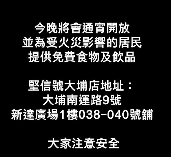 江若琳亦表示老公萧润邦经营的餐厅,因为火灾将会通宵营业,并为灾民提供食物及饮品,并呼吁大家要注意安全:“今晚将会通宵开放并为受火灾影响的居民提供免费食物及饮品,坚信号大埔店地址:大埔南运路9号新达广场1楼038-040号铺,大家注意安全。”