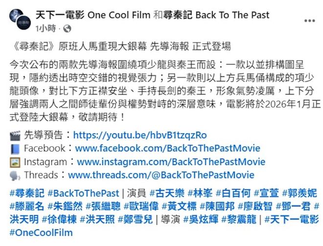 电影《寻秦记》将于 2026 年 1 月正式登陆大银幕,令人期待。昨日官方公开了两张先导海报,一款以并列构图呈现,隐约透出时空交错的视觉张力;另一款则以上方由兵马俑构成的项少龙头像,对比下方正襟危坐、手持长剑的秦王,形象气势凌厉,通过上下分层,强调两人之间的师徒辈分与权势对峙的深层含义。 官方列出的演员名单包括古天乐、林峯、白百何、宣萱、郭羡妮、滕丽名、朱鉴然、张继聪、欧瑞伟、黄文标、陈国邦、...