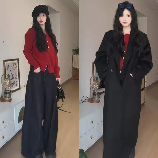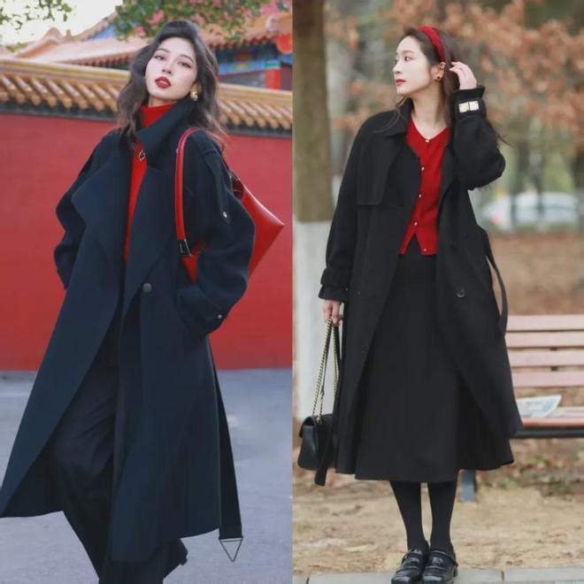 就比如说,我们可以选择一件红色的内搭,外面套上黑色大衣,下装穿一条黑色的裤子或者裙子,这样红色作为辅色,黑色作为主色,整体造型就会很协调。