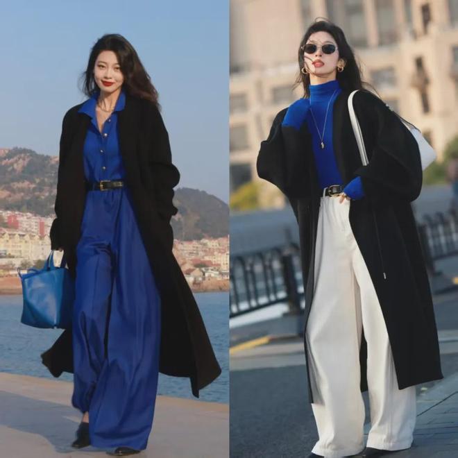 蓝色和黑色一样,都能给人一种冷静、沉稳、内敛的感觉,这两种颜色搭配在一起,会让整体穿搭显得特别干净利落,还会给人一种清冷又优雅的感觉。