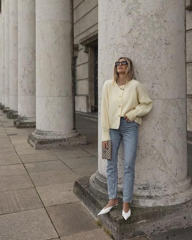 黄色奶奶衫,能达到四两拨千斤的效果,轻松营造冬日的慵懒惬意,搭配一件蓝色牛仔裤,就能轻松达到显瘦显高的效果。