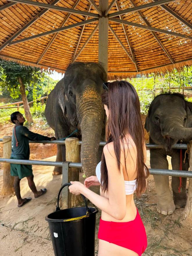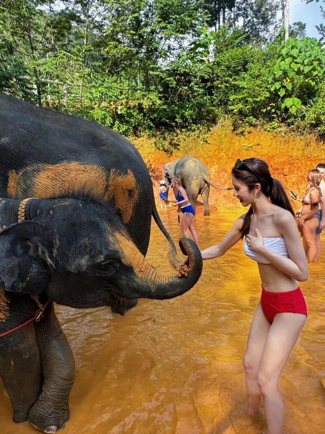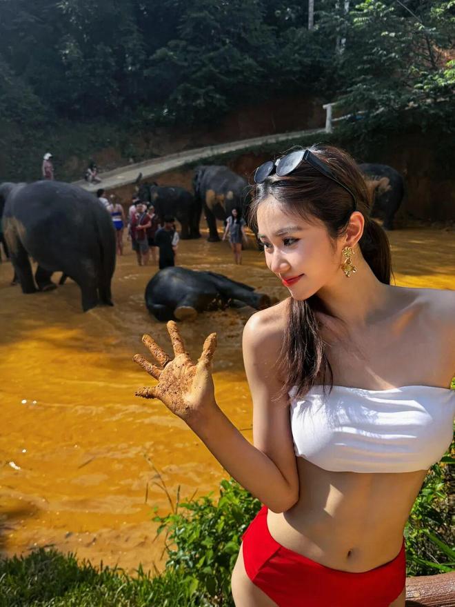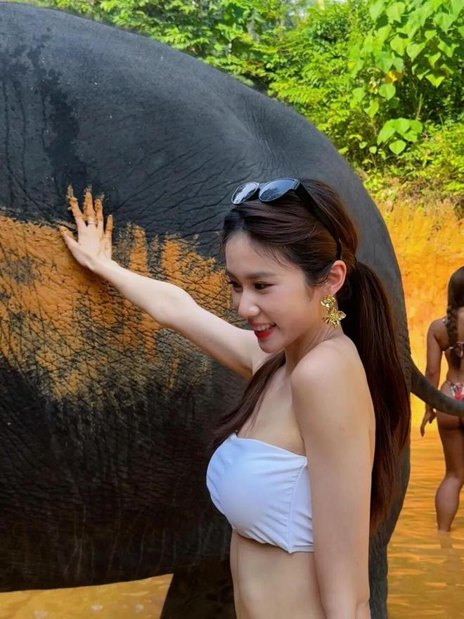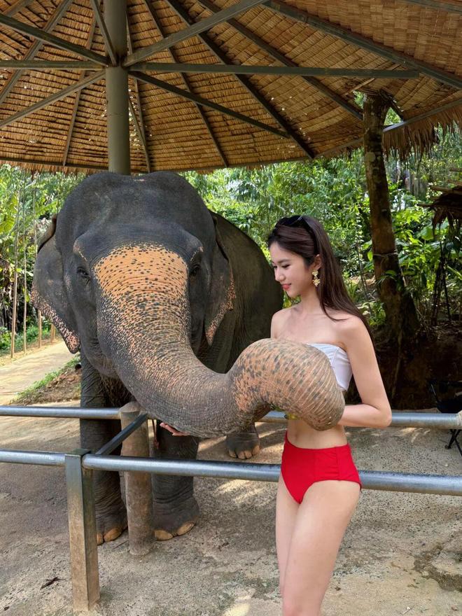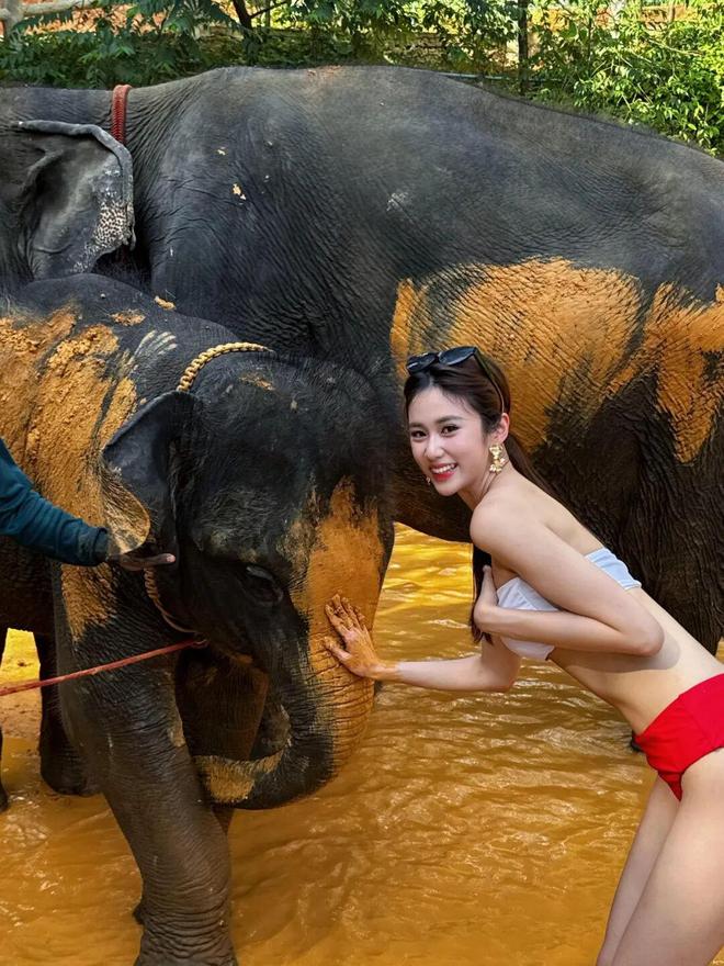 23岁港姐季军穿红白比基尼,给大象搓澡!靓照被赞性感尤物!