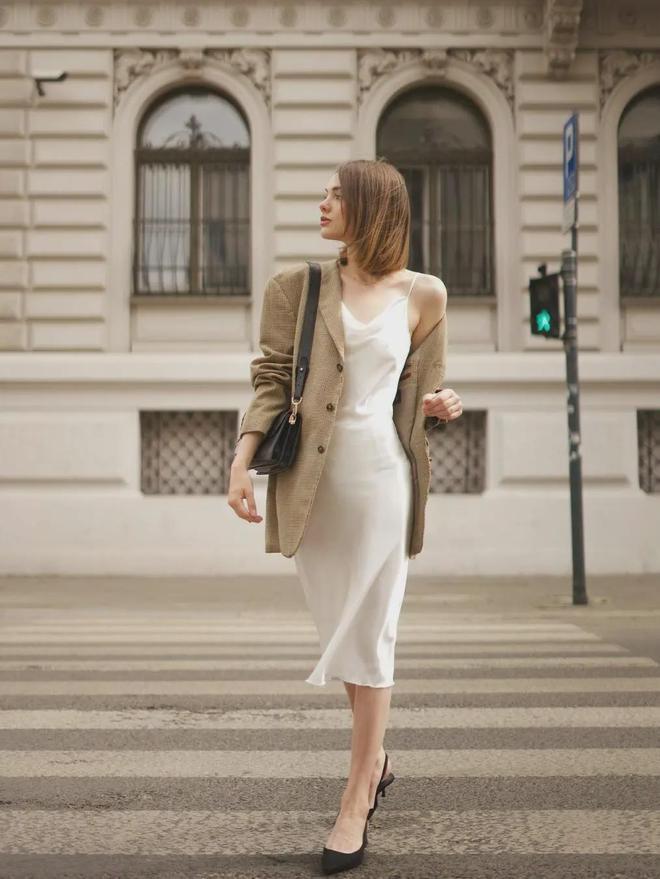 卡其色西装外套,尽显摩登都市里独立,自信的现代女性风采,内搭一件吊带连衣裙,每一步都散发着独特的魅力