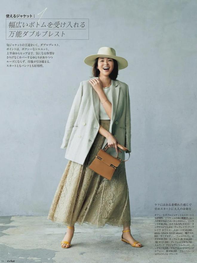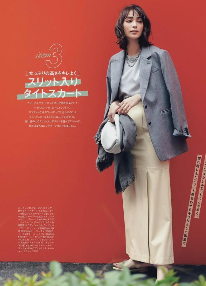 灰色西装外套,因为松弛有度,很好地划分黄金比例显高又显瘦,很适合东方女人的气质。