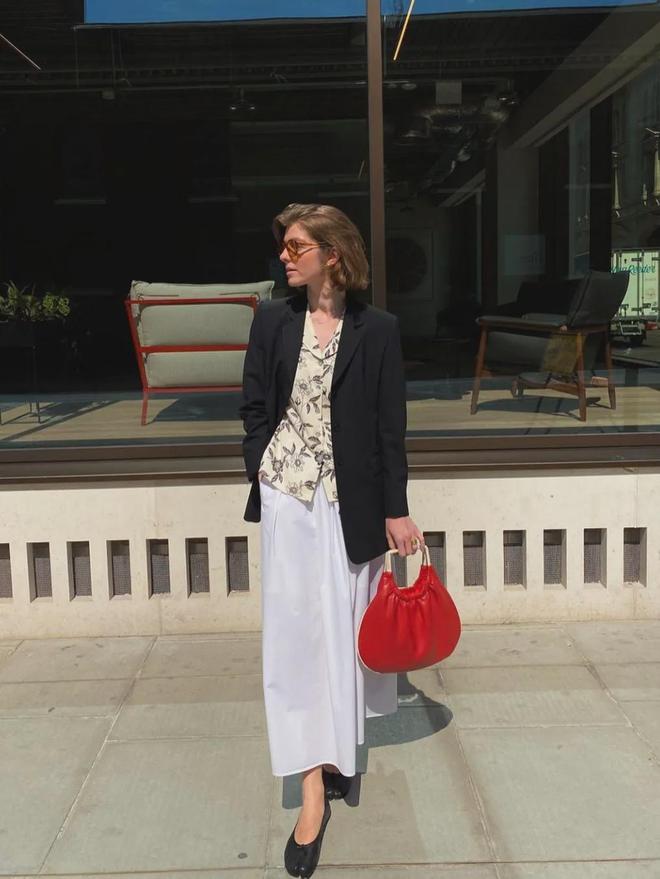 搭配一件白色真丝半裙让层次更清晰,也凸显身体比例,一双黑色乐福鞋的搭配,展现随性之美