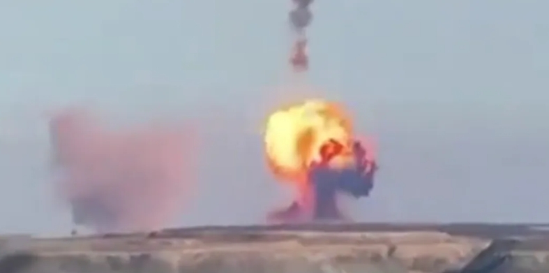 由于拍摄距离过远,无法确认具体型号,但根据爆炸现场产生的紫红色火焰来看,很可能是冷战时期的核导弹,因为冷战时期的液体洲际导弹普遍采用四氧化二氮和偏二甲基肼混合燃料,它们的燃烧特征正是紫红色火焰。
