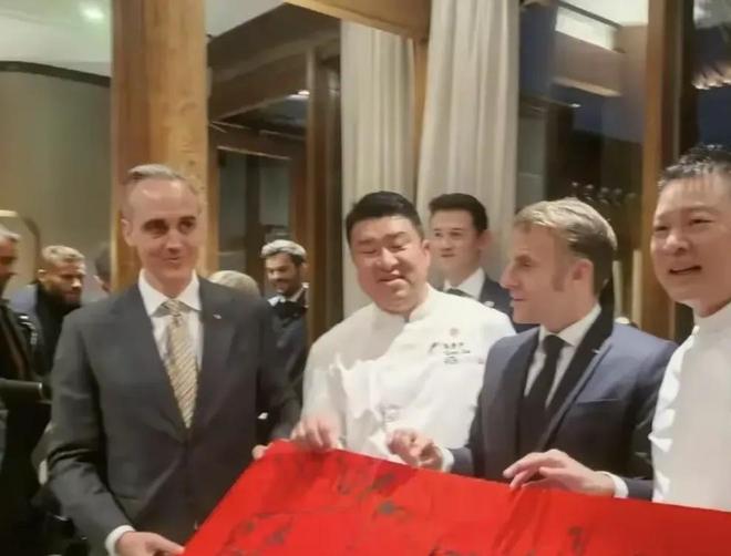 马克龙那幅字写得怎么样不清楚,但吃完饭能提笔写字,说明挺满意这顿烤鸭。布里吉特也在旁边拍照,感觉他们对中华美食确实感兴趣。