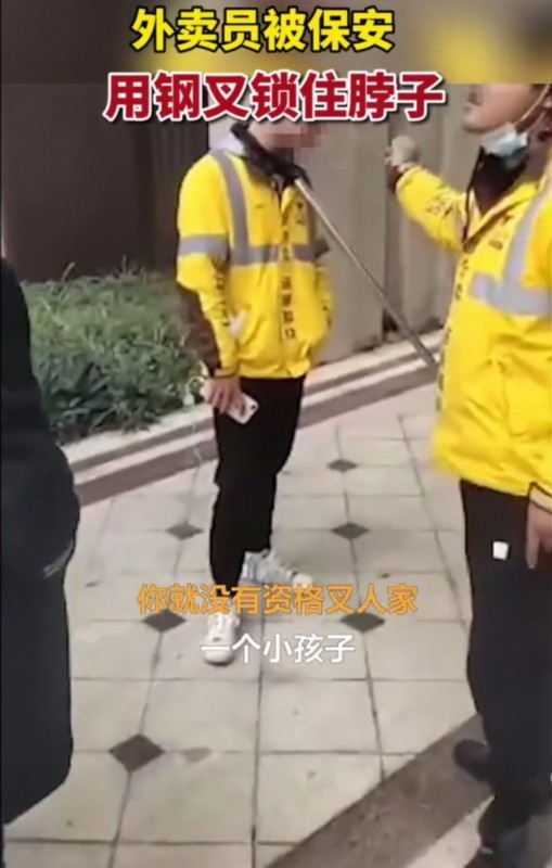 外卖员被保安用钢叉锁住脖子 同事怒了:你把他当人了吗?