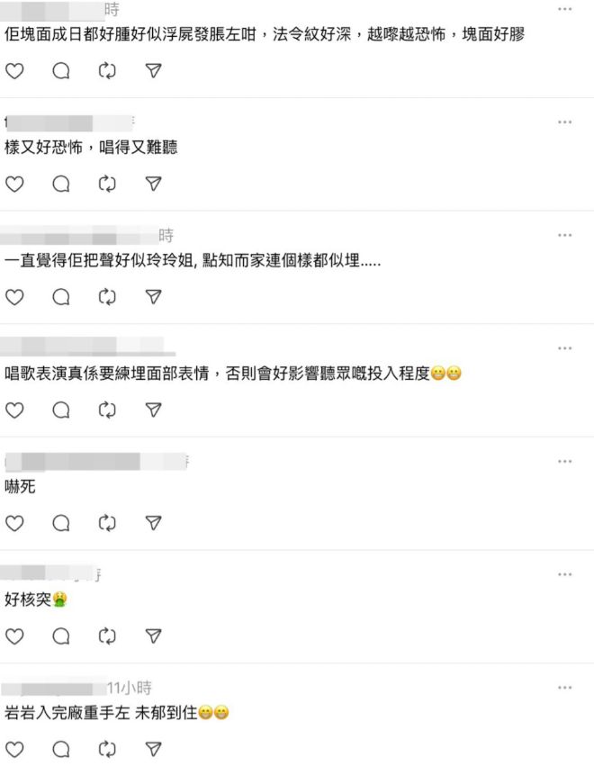 有网友评论:“唱功先不说,这表情是怎么回事,也太狰狞了吧、第一次见人唱歌时面部肌肉像老虎纹路一样扭曲、这表情也太恐怖了、唱得这么费劲,表情管理还这么差。