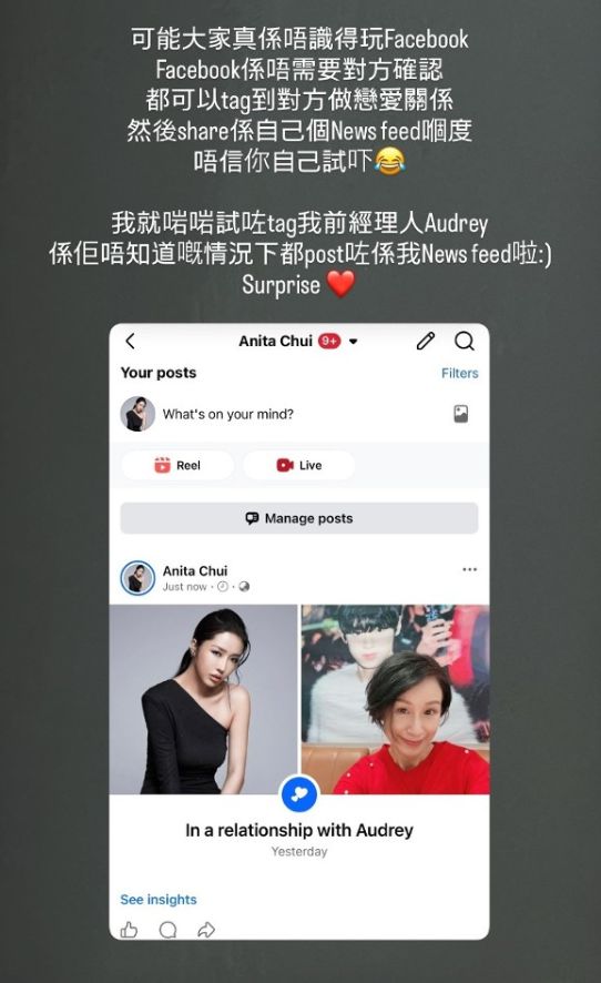 但因为我本身不太擅长使用社交平台,我以为私人Facebook的内容是不会被其他人看到的,我还以为更改感情状态必须经过对方确认才会显示出来。谁知道原来就算Anita没有确认,这个状态也会显示在我的私人Facebook上,结果搞得所有人都看到了。