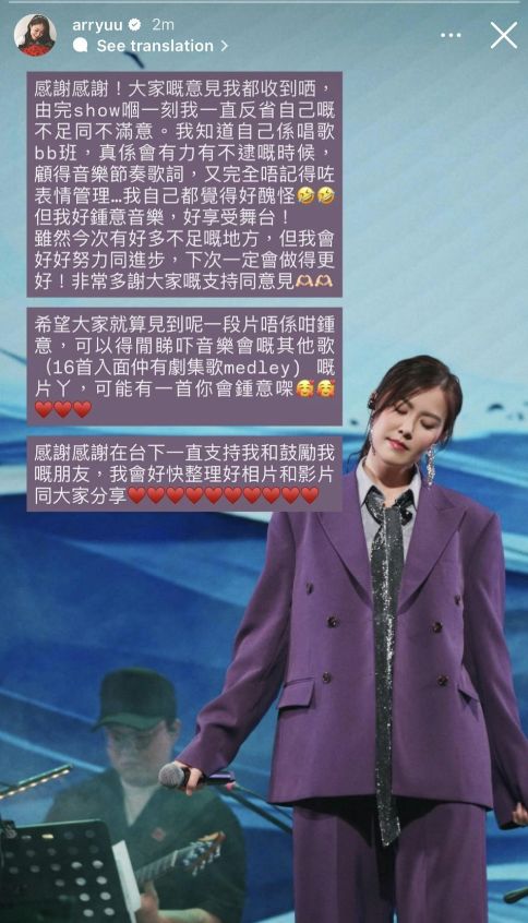 她还补充说:“希望大家就算看到这一段视频不太喜欢,也能抽空去看看音乐会其他歌曲的片段(16 首歌里还有剧集歌曲串烧),说不定有一首会合你心意呢。♥️♥️♥️”
