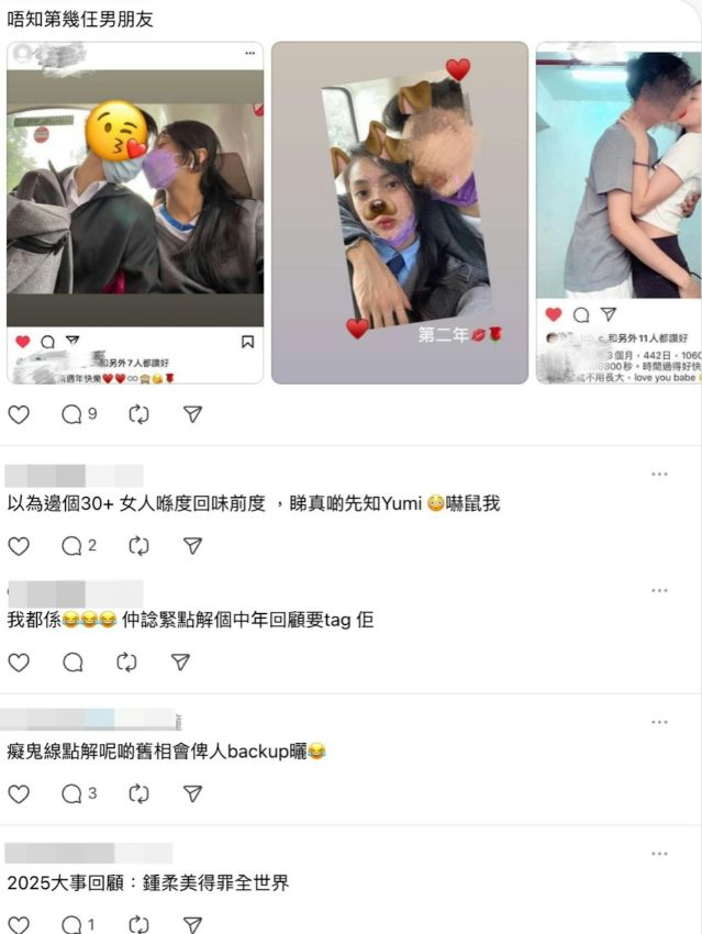 随着钟柔美相关话题的热度持续攀升,今日凌晨,有网友更公开了钟柔美与前男友的照片。当中两张二人身穿校服,钟柔美戴着口罩都要Kiss,甜爆庆祝拍拖两周年。至于最大尺度一张,两位主角来到后楼梯激吻,男方更伸手放在女方臀部,但不知是否Yumi本人。