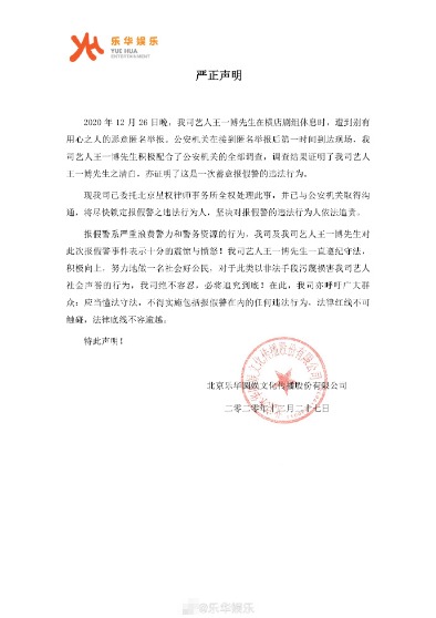 12月27日凌晨,乐华娱乐发布声明,称王一博在横店剧组休息时被人蓄意匿名报假警,王一博配合了全部调查,调查结果证明其清白,同时表示,已与公安机关沟通,将尽快锁定违法行为人。