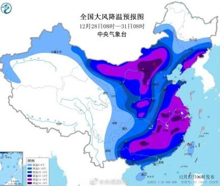 27日白天起,强冷空气将开始影响新疆北部,未来将自西向东自北向南影响我国中东部大部地区,带来大风和强降温天气。预计28日至31日,中东部大部地区气温将下降8~10℃,西北地区东部、东北地区东南部、华北西部和北部、黄淮南部、江淮、江南、华南中北部等地降温12~14℃,局地降温幅度可达14℃以上;降温过后,最低气温0℃线将南压至华南北部一带,最低气温-10℃线在黄河下游到秦岭一带;中东部大部地区将有4~6级、阵风7~9级偏北风,我国东部和南部海区有7~9级、阵风10~11级偏北风。
