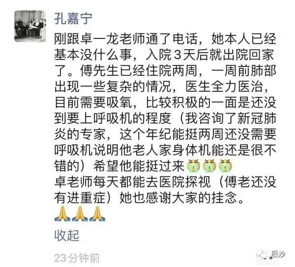 在27日,傅聪的学生、英国皇家音乐学院教授孔嘉宁发文透露,“傅先生已经住院两周,希望他能挺过来。”当时,傅聪夫人卓一龙已经出院,但傅聪本人住院两周还没有用到呼吸机。孔嘉宁理解为傅聪身体机能很不错,希望他能挺过来。但很不幸,傅聪还是在英国疫情失控的寒冬里走了。