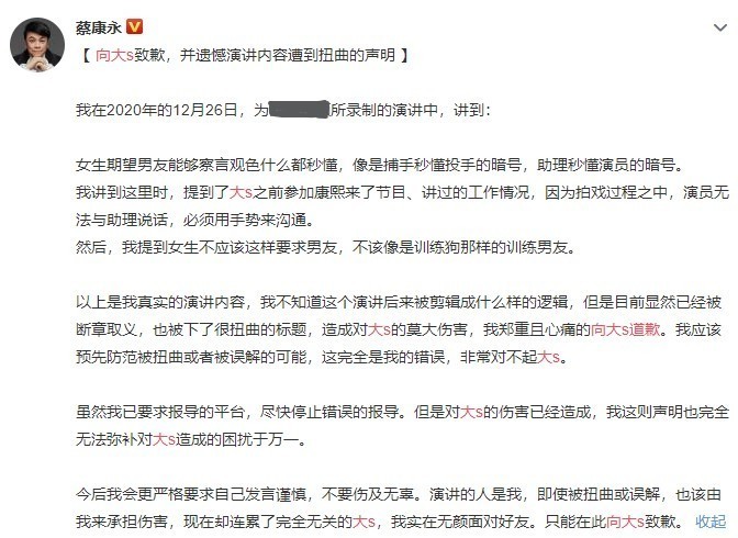 蔡康永是大家公认的高情商、会说话的人,可昨天他却在社交平台公开发文,为自己的不当言行对大S道歉。