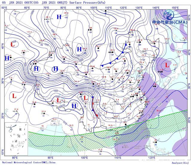 1月5日,我国迎来了二十四节气中的小寒节气,小寒是二十四节气中的第23个节气,顾名思义就是天气寒冷但还没有冷到极致的时候,与大寒节气对应。小寒节气之后是大寒节气,这两个节气前后往往就是我国一年中最冷的时候了。北京时间1月5日上午8点,从中央气象台公布的地面天气图上看,今天我国以北的蒙古高原西部和西伯利亚,庞大的冷高压系统以及形成,蒙古高原西部的高压中心气压超过1065百帕。