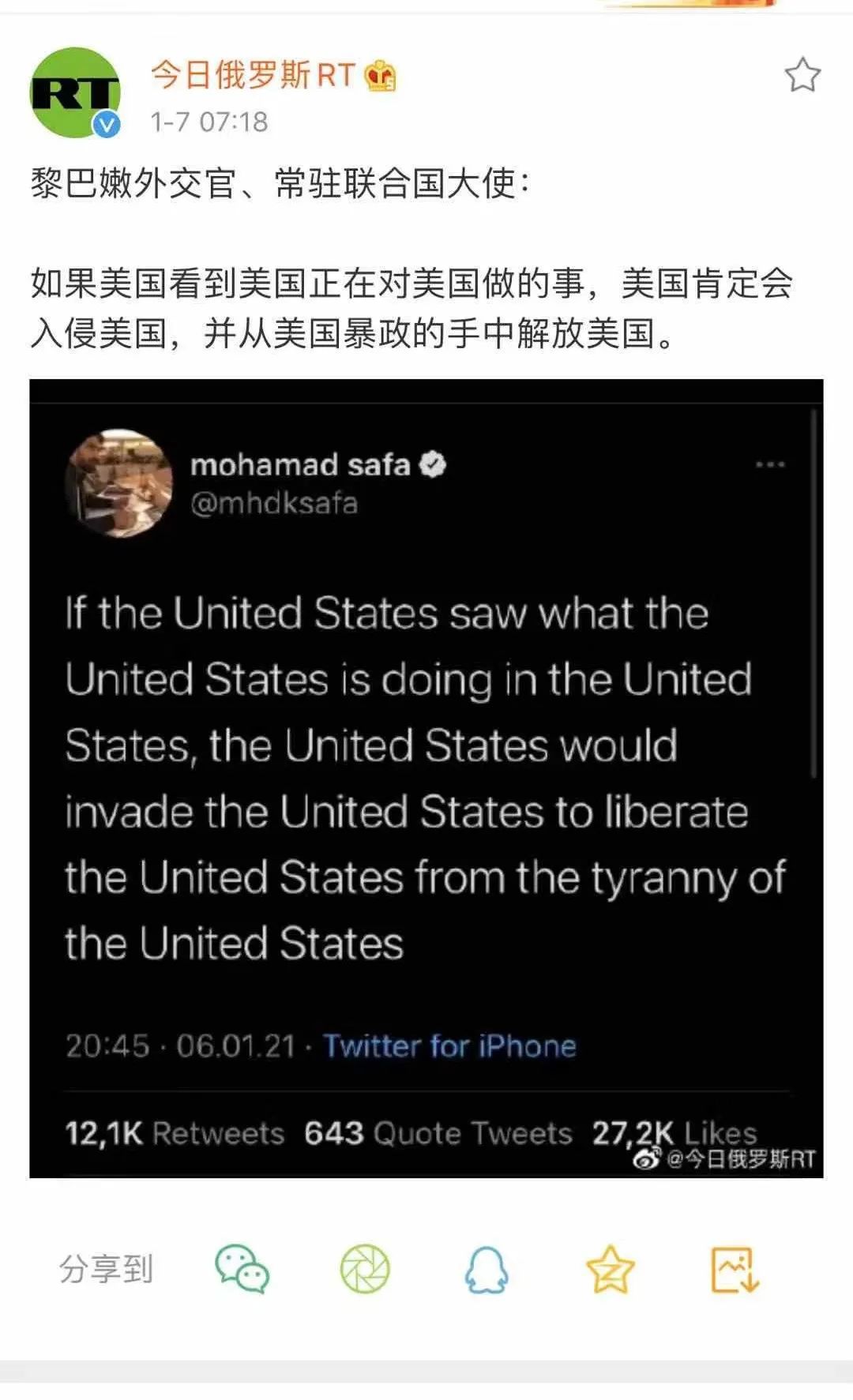来源微信公众号:补壹刀 执笔/刮胡刀、李小飞刀&胡一刀 华盛顿特区疯狂的一夜,让美式民主的脸丢尽了。 从美国四面八方赶来“勤王”的那些特朗普粉丝,疯狂地冲进了国会大厦。国会立即休会,议员们纷纷躲到桌椅下面,彭斯则直接通过地下隧道撤离。有抗议者高坐在众议长佩洛西的办公椅上,而佩洛西因为逃得匆忙连电脑屏幕都还没来得及关上…… 有人死亡,有人受伤,有人被捕。更气愤的是那些美国政治精英,美式民主的“根”就这么被刨了,而且是在全世界目前直播。 但是,美国“乱了”,世界却难得有了短暂的宁静。 1 一场暴乱。 4人死亡、52人被捕、14名警察在冲突中受伤,其中2人重伤; 特朗普推特账号被禁言12个小时、脸书和INS账号被禁言24个小时,Snapchat被无限期禁言; 白宫团队已经有先后4人宣布辞职。首先是梅拉尼娅幕僚长、前白宫新闻秘书斯蒂芬妮·格里沙姆,紧接着,白宫社交秘书尼凯塔与白宫新闻副秘书马修斯也递交辞呈;最新消息传来,白宫国安副顾问博明宣布辞职,而国安顾问奥布莱恩也有走人的意思; 2021年1月6日,短短几个小时里,华盛顿国会山地动山摇,美国进入历史上“最黑暗一天”。 6日下午1点,华盛顿国会大厦按计划开始召开参众两院联席会议,对选举人票进行最后清点。如无意外,所有工作完成后,副总统兼参议院议长彭斯将正式宣布2020年美国大选的最终结果。 然而,意外就这么发生了。 下午4点左右,成百上千的特朗普铁粉们开始聚集到国会大厦周围,随着抗议者冲破围栏,闯进国会山,有的直接爬上国会山二楼,场面开始失去控制。 而国会发言人讲台则被人直接扛走,很快ebay上就出现了购买链接…… 国会立即休会,议员们纷纷躲到桌椅下面,彭斯则直接通过地下隧道撤离。 2021年,谁会想到能看到这样的开端呢…… 骚乱平息后,国会大厦继续开会,这一场突如其来的暴乱也让共和党输得更加彻底。 此前,有140名共和党议员明确表示,将对多州的选举结果提出质疑,而按照规定,只要有一名众议员和参议员联署对某州的选举结果进行挑战,联席会议就得休会,由参众两院各自开两个小时的辩论会,然后再表决。 这样一来,大量时间就会被耗费在不停的辩论上,大选的正式结果宣布又得推迟。 暴乱之后,重新开会,彭斯首先表态:暴乱无法改变大选结果。 过去四年一直与特朗普站在一起的参议院议长麦康奈尔也明确割席:“这些情况绝对不允许被接受”。 多名此前支持对大选结果提出质疑的共和党议员谴责暴乱,收回质疑。 共和党人心一散,接下来的表决工作就像开了倍速一样被推进。先是参议院决定取消两个小时辩论环节直接投票,紧接着原本有140多名共和党议员都说要反对多州的选举结果,然而最后只有6、7名议员站了出来。 因此,佐治亚、密歇根、内华达、宾州这些大选时的关键摇摆州结果很快就确认了,彭斯口齿清晰、语速飞快,看来是下定决心要连夜完成清点任务。 7日凌晨,结果出炉。彭斯宣布“拜登获得306张选举人票,而特朗普获得232张”,拜登当选新一任美国总统。 终于尘埃落定。 特朗普见大势已去,也发表声明,承诺1月20日会向拜登“有序”移交权力,尽管他还是嘴硬地声称:“我完全不同意这个选举结果”。 2 本来,今天台海有另一件预发的大事,是美台政治军事对话。 这个对话层级不高,年年举行。2019年,美国国务院负责政治和军事事务的副国务卿克拉克·库珀,就曾与台湾“驻美代表”高硕泰对了一次话,库珀只是事后发推承认有此事,但没有透露与对话有关的任何信息。 然而这次不一样,美国务院提前“罕见高调”地在公开行程中公布台美将举行军事政治视频对话会议的消息。 此举也令台湾媒体大为兴奋,它们分析称,这是美国总统特朗普任内最后一次利用政军对话打“台湾牌”刺激大陆,拜登上台后应该不太可能再用政军对话打“台湾牌”。美国国务院今年如此高调,应该有奉特朗普或者蓬佩奥之命,达到留下“政治遗产”的目的。 北京时间早7时30分,距离美国国会安保部门宣布控制局势不久,这场预演许久的对话,躲在全世界投向华盛顿“战场”的炽热目光下,悄无声息的展开。台“外交部长”吴钊燮是在上午出席行政院院会会后记者会回答提问时,才证实对话已经结束,“所有细节包括什么时间?在哪里?有什么人参加?层级?谈了什么事情?”,都不方便透露。 “特朗普任内最后一次利用政军对话打‘台湾牌’”,为何打得如此沉闷? 除开政军对话涉及美台军事合作故而敏感的因素之外,参与对话的库珀等人,剩不下几天,就要随着特朗普卷铺盖走人,也多少心思真正放在对话上?家里此刻正死人失火,他们还有多少心思在外面煽风点火? 事实上,不单是参与政军对话的美国外交人员。美国驻外机构在各大社交媒体的发声窗口,在示威者冲入国会的那一段时间,都静默了。 美国国务院的网站首页更新停留在5日:一条继续承认瓜伊多,支持“他从马杜罗的威胁和迫害中解放出来”;一条歌颂美国在中东的“事业”,海湾和阿拉伯国家团结取得的突破;一条制裁支持伊朗金属工业的公司;一条批评尼加拉瓜“不断恶化的人权”。最大的标题字号自然要留给中国——“对人权的漠视”。 美国驻华大使馆在6日晚7时13分,介绍犹他州的布莱斯峡谷森林公园后,过了近20个小时,才更新转发了蓬佩奥称示威者是“罪犯”,“这样的暴