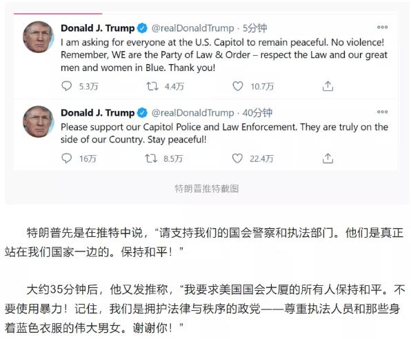 然后,川普迅速认怂,发推要求支持者要和平不要暴力。