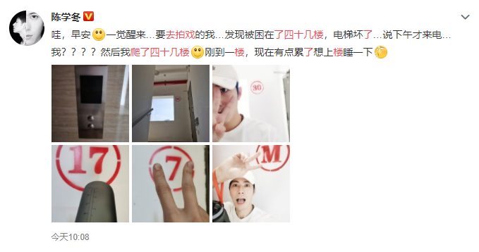 8月16日,陈学冬发文诉说自己惨痛的经历。一大早起来去拍戏,结果发现电梯坏了,被困在四十几层,只能选择徒步走楼梯走到1楼:“哇,早安。一觉醒来…要去拍戏的我…发现被困在了四十几楼,电梯坏了…说下午才来电…我????然后我爬了四十几楼。刚到一楼,现在有点累了想上楼睡一下。”