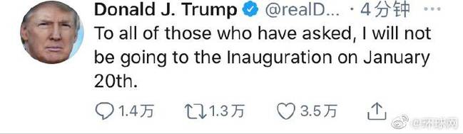 0日不会参加拜登的就职典礼刚刚,特朗普发推称,自己1月20日不会去参加拜登的就职典礼。