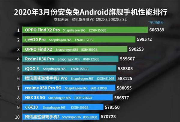 3月的榜单全部被骁龙865手机占领,丝毫没有麒麟990 5G等芯片的影子,可以说华为这一次还是输给了高通。搭载了麒麟990 5G芯片的华为P30 Pro 5G,此前在安兔兔跑分上获得超45万分的分数。虽然这一成绩也很不错,但是与榜单上跑分最低的黑鲨游戏手机5相比,还是有着12万分的差距。