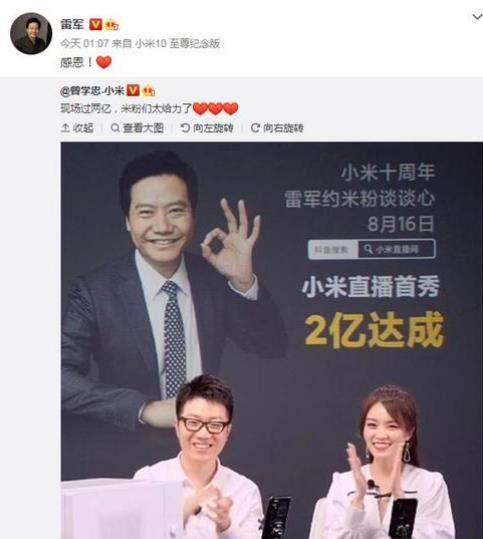 昨晚 20 点,小米创始人、董事长兼 CEO 雷军在抖音上开启了其直播带货的首秀。小米公司官方宣布,雷军在直播进行两小时后,支付金额破亿。