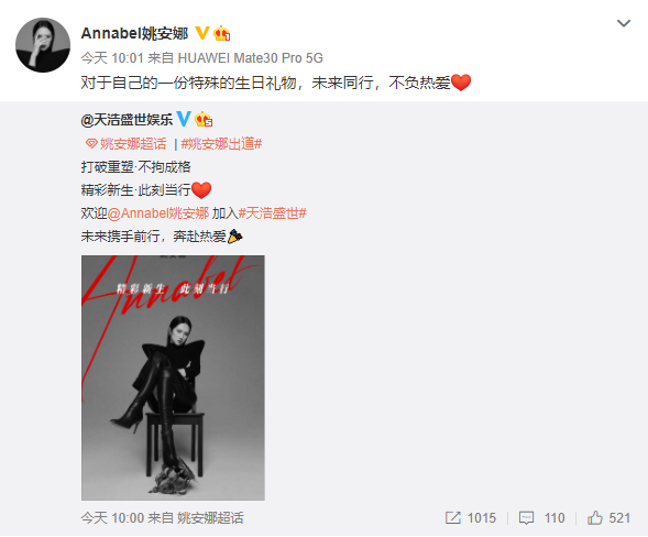1月14日,天浩盛世娱乐公司官博发文,官宣姚安娜加盟。该动态获姚安娜转发,并说到“对于自己的一份特殊的生日礼物,未来同行,不负热爱。”据悉,姚安娜是华为创始人任正非的小女儿,出生于1998年1月14日,出道日正好是她的生日。