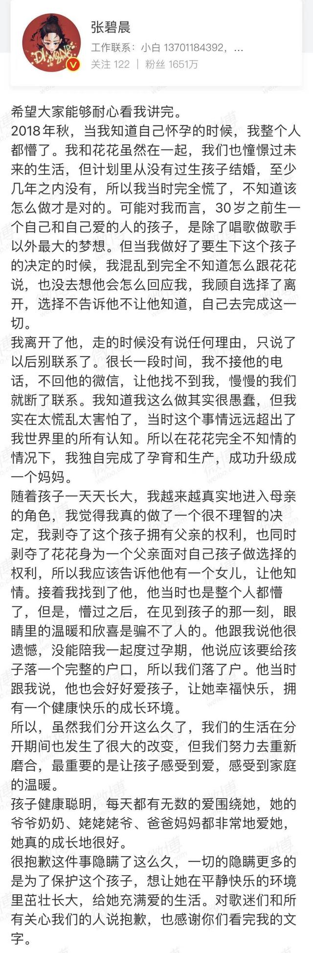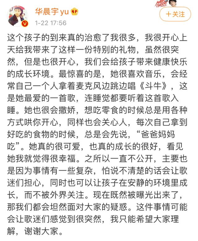 近日,网曝华晨宇张碧晨二人已经生子,孩子一岁了。1月22日下午,华晨宇回应:“是的,我们是有一个孩子。”随后,张碧晨发长文承认与华晨宇有一个女儿,称生下这个孩子的决定没有告诉华晨宇,自己在花花完全不知情的情况下,独自完成了孕育和生产,成功升级成一个妈妈。