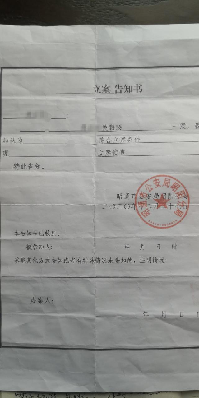 8日,经过走访,核实了那份”立案告知书“,并得知昭阳区警方现已立案侦查,正在深入侦办这起案件。