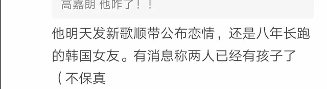 高嘉朗突然的发文告白,源自于26日网络对他的爆料,网络爆料称高嘉朗会趁着新歌发布之际,官宣恋情和自己的孩子,而且还说了具体日期,就是今天,现在高嘉朗突然宣布恋情时间点已经契合,不过高嘉朗并未在发文中提到自己有孩子。