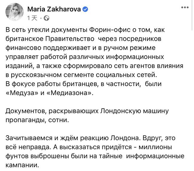 据俄罗斯Vesti电视台报道,当地时间2月21日,俄罗斯外交部发言人扎哈罗娃在社交媒体上发布消息称,据从英国外交部门泄漏出来的消息,英国政府正通过在俄罗斯境内的代理人网络操控俄罗斯境内的俄语媒体,其中包括传统媒体和网络媒体。莫斯科正等待伦敦方面对此做出解释。